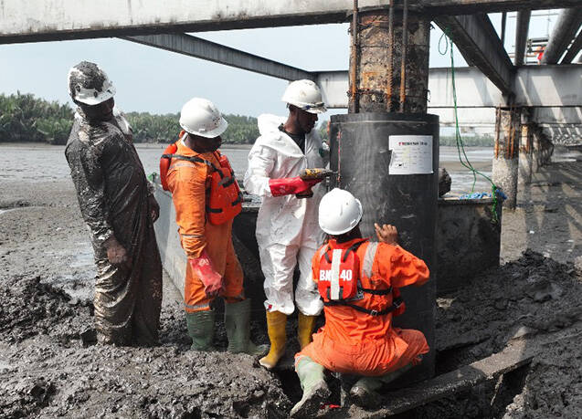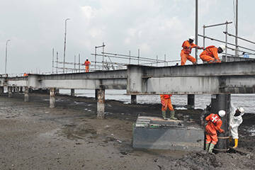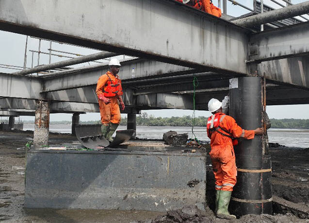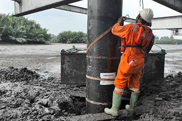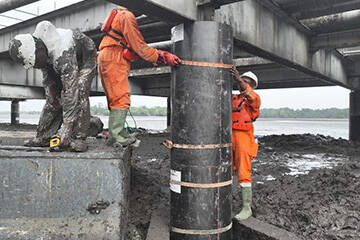 • ต้องทำความสะอาดเสาเข็มป้องกันทุกระดับที่ระบุ และกำจัดวัสดุที่หลุดล่อน สนิม สิ่งมีชีวิตในทะเล และอื่นๆ โดยใช้การขูดและฉีดน้ำแรงดันสูง